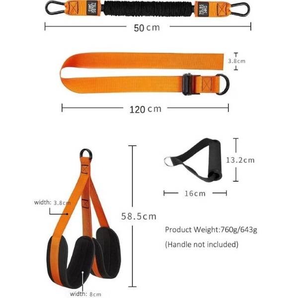 2x ili 3x lateks trake za otpor (u zavisnosti od nosivosti: verzija od 70 kg uključuje 2 trake; verzija od 100 kg uključuje 1 dodatnu traku za veći otpor)
