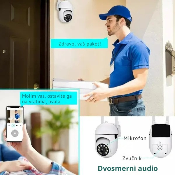 Korisni ugrađeni mikrofon na sigurnosnoj kameri za eksterijer omogućava vam da govorite preko naše aplikacije. Dvosmerni zvuk vam omogućava komunikaciju sa ljudima, a alarm pokreta vam omogućava da se oslobodite nepoželjnih ljudi ili životinja.